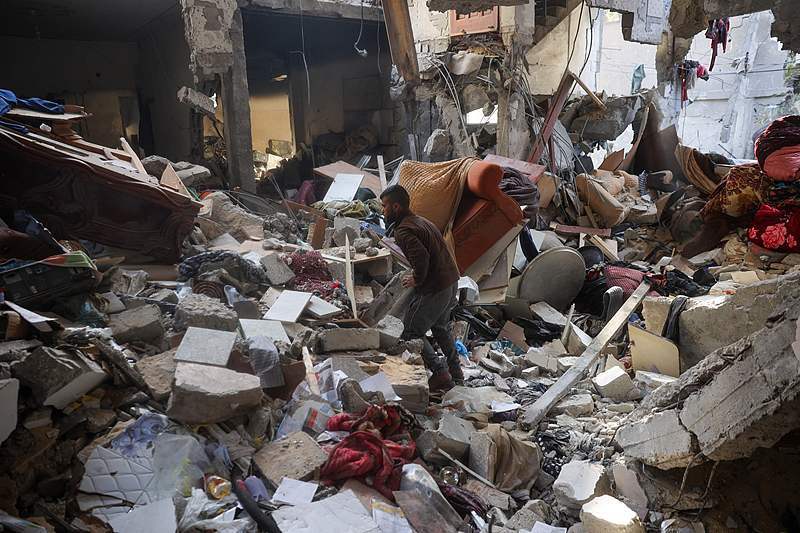 △以色列收复紧迫加沙后,别称须眉在一遭袭百姓营的废地中寻找物品。