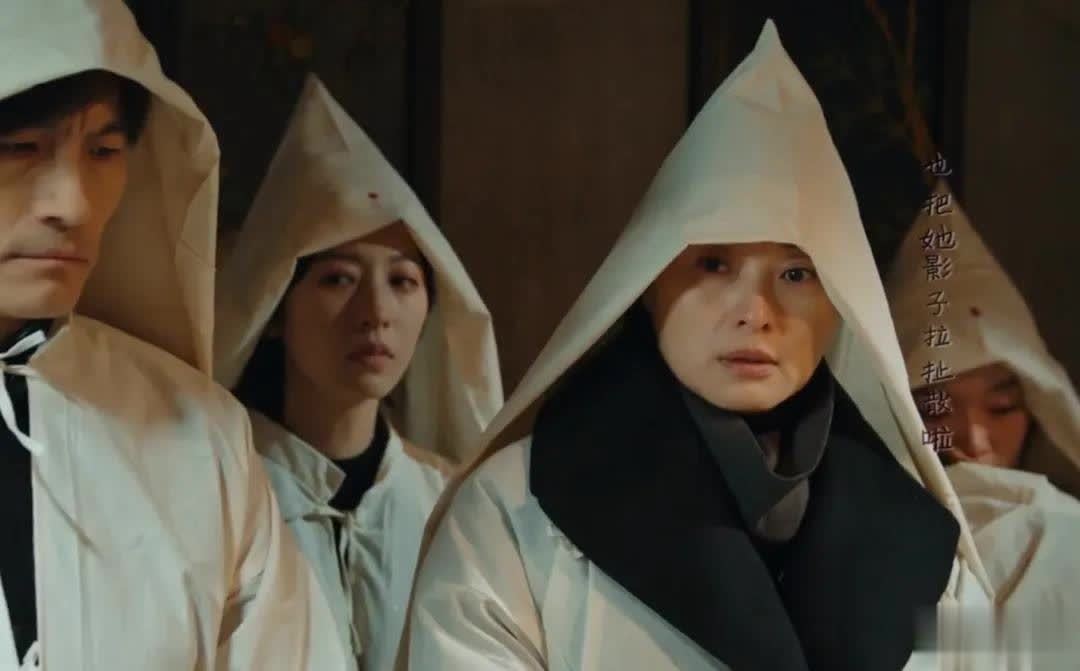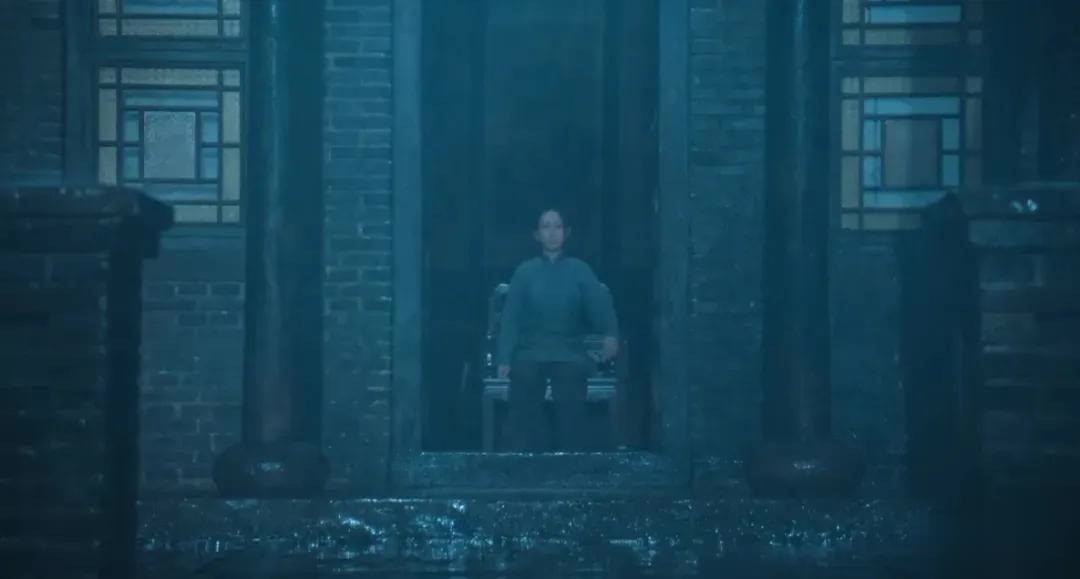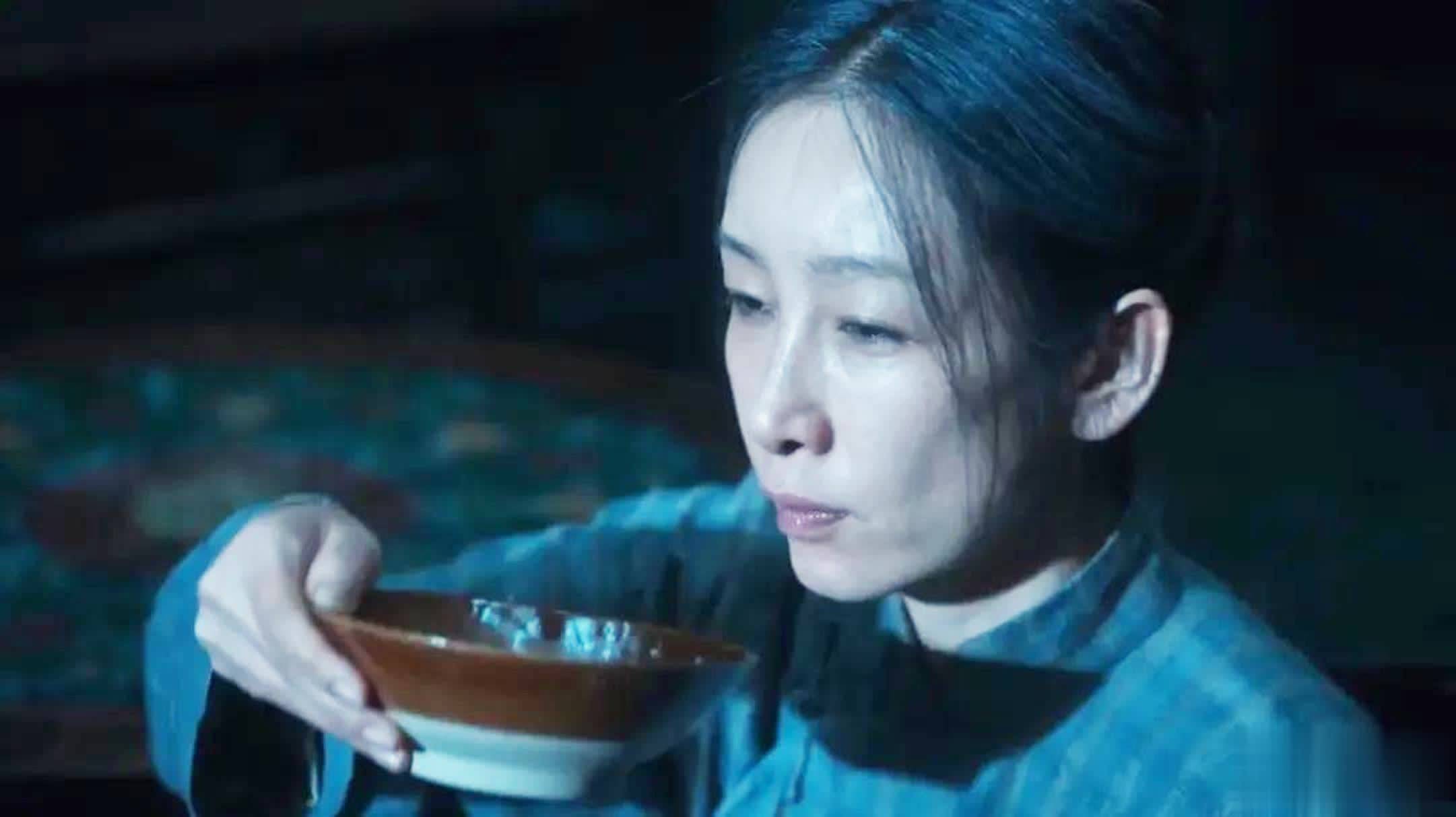 苏苏佳偶中毒故去后,她在门口喝毒粥自裁,大雨里,坐在中间的秦海璐,像极了代表费家的鬼影。