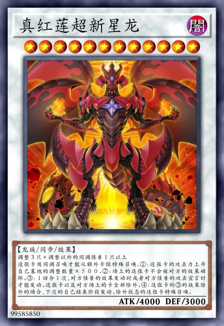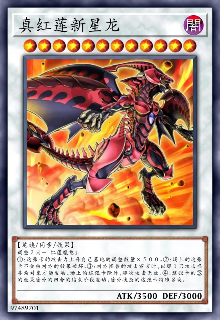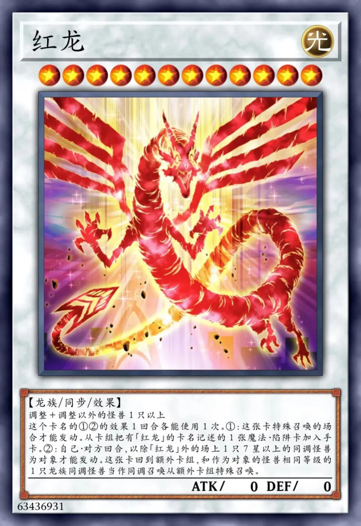 ①特召时检索卡组有“红龙”卡名的魔法/陷坑。②可复返极度卡组,将场上另一只7星以上同调怪兽替换为同等第龙族同调怪兽