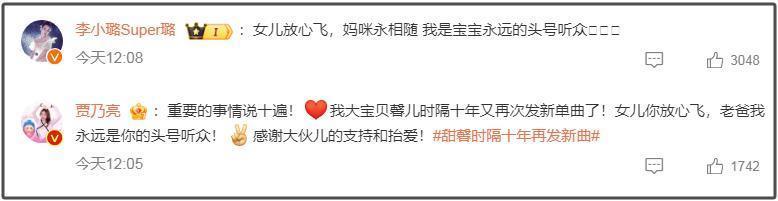 十年前,甜馨因为搞笑的个性在萌娃综艺中脱颖而出,之后又因为父母离异争议在互联网领有超高话题度。这次发布单曲出谈领有专科的宣发,一看就不是玩票性质,先是由乐华文娱发布,然后贾乃亮李小璐顺次评论转发相沿,相等熟谙。