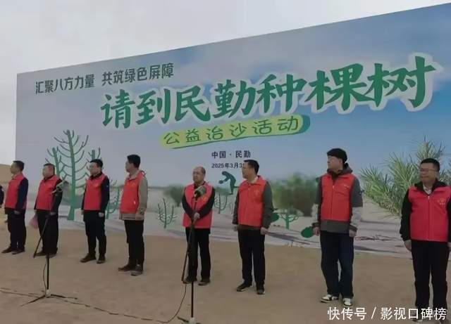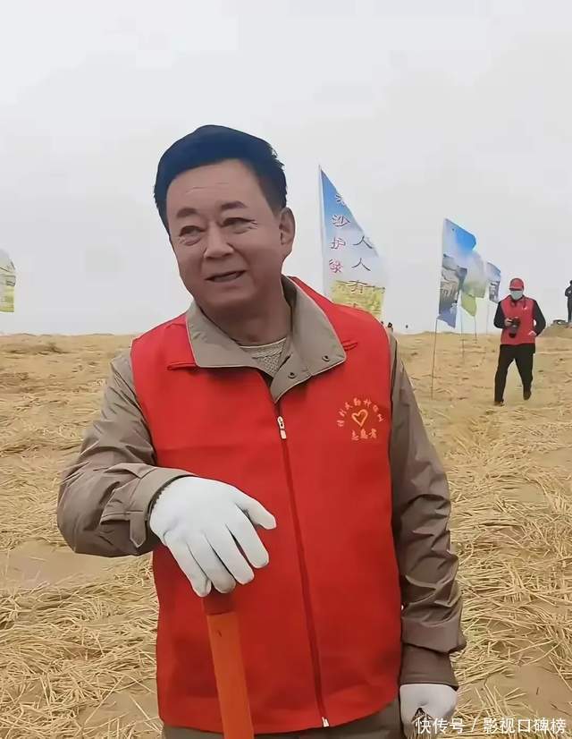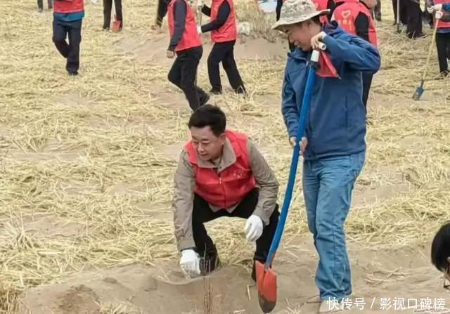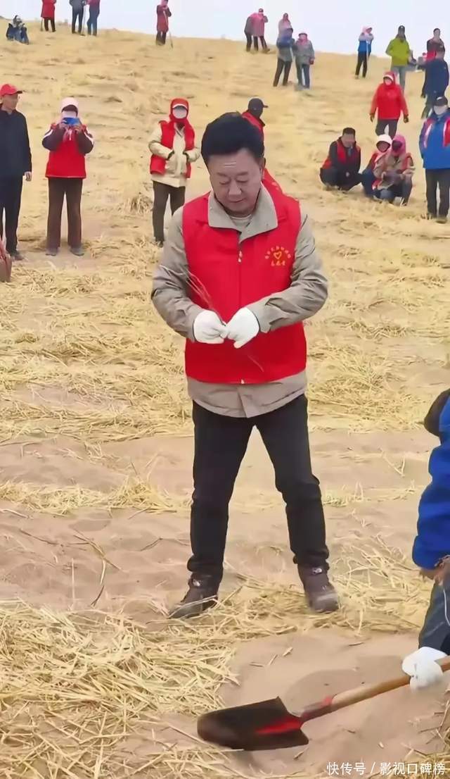 画面中的他,衣着最平凡的卡其色外衣搭红色的公益马甲,用一口流利的家乡话和乡民打呼唤,同期他还积极反应民勤县发起的“请到民勤来种树”的活动。