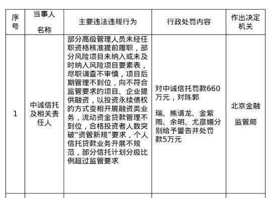 罚单裸露,中诚信赖的主要违法违纪作为是:部分高档处理东谈主员未经任职阅历核准提前履职,部分风险名目未纳入或未实时纳入风险名目成分表,守法访问不审慎,名目后期处理不到位,向不妥当监管条目的名目、企业提供融资,以投资永续债权的状态变相开展融资类业务,流动资金贷款处理不到位,及格投资者东谈主数冲突“资管新规”条目,个东谈主信赖贷款业务开展不标准,部分信赖策分离级比例早先监管条目。