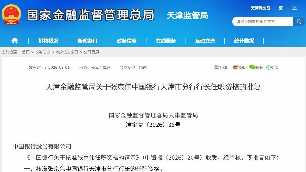 2026年3月6日,张京伟中行天津市分行行长的任职履历获准。