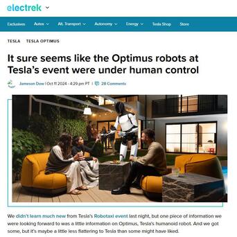 外媒原文标题:《It sure seems like the Optimus robots at Tesla’s event were under human control》,源自:electrek网 见截图,该信息非个东说念主虚构